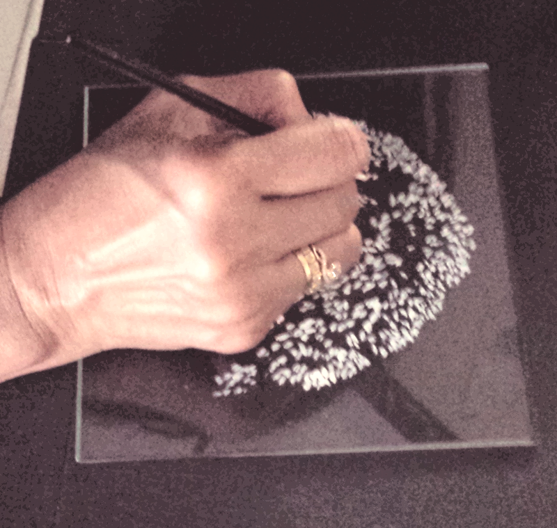 Verre églomisé – the art of reverse painting on glass using transparent colours and gold-leaf. This reverse painting on glass, is challenging but satisfying, as the painting begins with the highlights and details. It progresses towards the background as the last stage. It requires risk taking and bold judgement about the initial layers, because they are difficult to correct. Maybe that is why Nora finds this project attractive as it reflects the risk taking and judgement making skills of a practicing doctor.